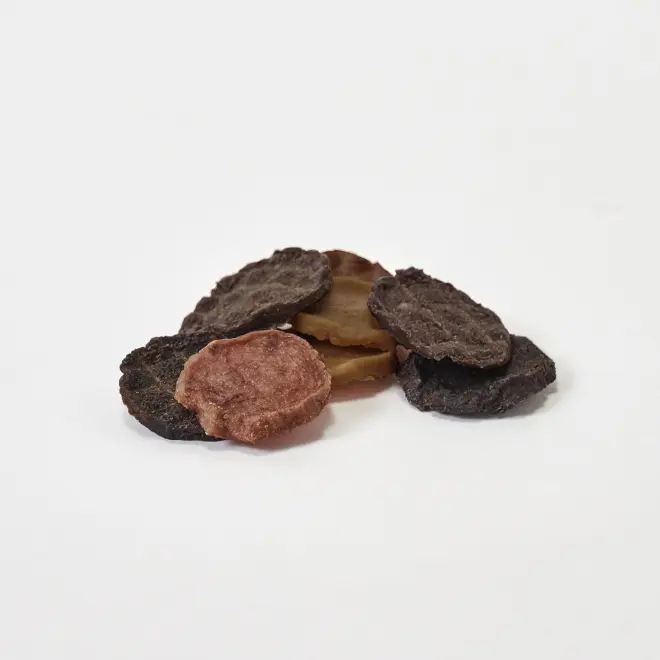 お肉・お魚だけを使用したグレインフリーの仕様なので、小麦などの穀物が合わない体質のワンちゃんはもちろん、原材料がシンプルなので、食物アレルギーで与えられる食材に制限があるワンちゃんにも選んでいただきやすいのではないかと思います。形状は、薄く伸ばしたチップスにすることで小型犬でも食べやすく、一口サイズに割ったり、砕いてフードのふりかけにしたりもできる汎用性を実現しました。
