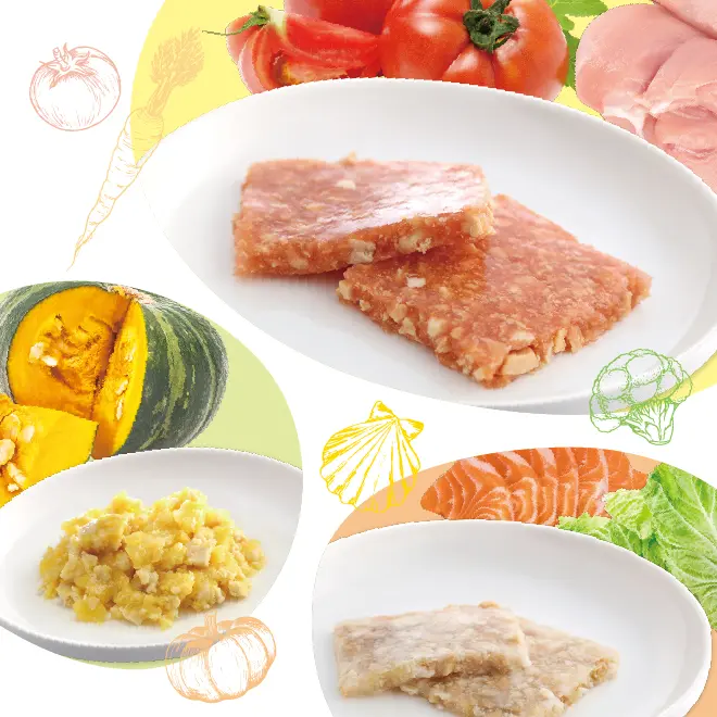 愛犬・愛猫が素材の旨味を噛んで味わえるよう、歯ごたえや食べやすさにこだわって作った、新食感のフードです。加熱してブイヨンに戻し、食材を加えてアレンジもできます。愛犬・愛猫が美味しく楽しい食事時間を過ごせるよう、そしてペットオーナー様が愛犬・愛猫の食事の準備を楽しめるようにと願いを込めて獣医師が考案した手作りレシピです。