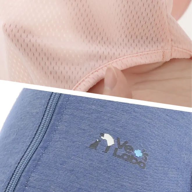 生地は伸縮性のあるメッシュ生地とデニム生地(小型犬用のみ)を採用しました。薄手で柔らかな肌触りのため、ワンちゃん・ネコちゃんの皮膚に負担をかけずに患部をしっかり保護でき、手術後も安心してご着用いただけます。
