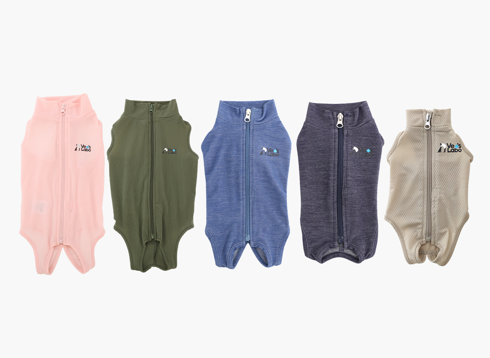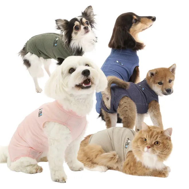 手術後にカラーではなく術後服を使用するのは、最近では一般的になってきてはいますが、それでも日常的に服を着ていない子にとっては大きなストレスになります。ストレスをできる限り感じさせない服を作ろうというコンセプトのもと、伸縮性や肌触りにこだわって生地を選び、犬猫の動きや骨格に合う、快適に過ごせる服を作りました。通気性の良いメッシュ生地(カーキ、ピンク、グレージュ)以外に、2023年秋にデニム生地のベッツウェアを発売しました。術後だけではなく、皮膚や被毛を守るために、普段着としても使っていただけるかと思います。