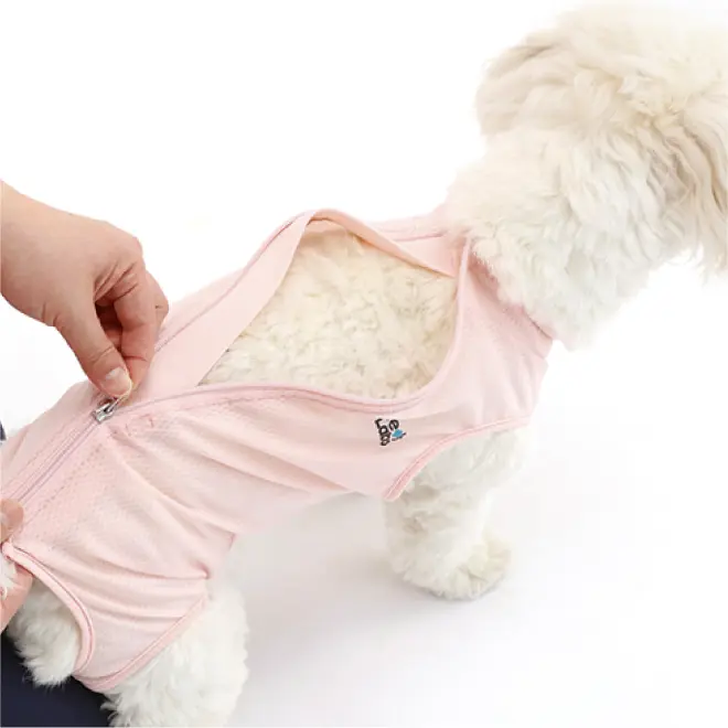 ができるので、ファスナーも上げ下げしやすく着脱が容易です。動物の骨格を考えて設計しているため、着用していても動きやすく、ワンちゃん・ネコちゃんにストレスを感じさせません。