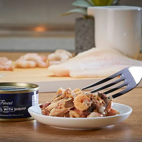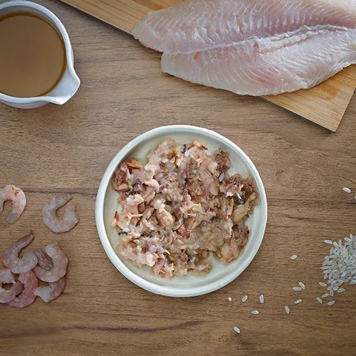 サバベースに小エビと、食感を良くするためにライスに加え栄養抜群のフィッシュスープのみという贅沢な缶詰シリーズ。