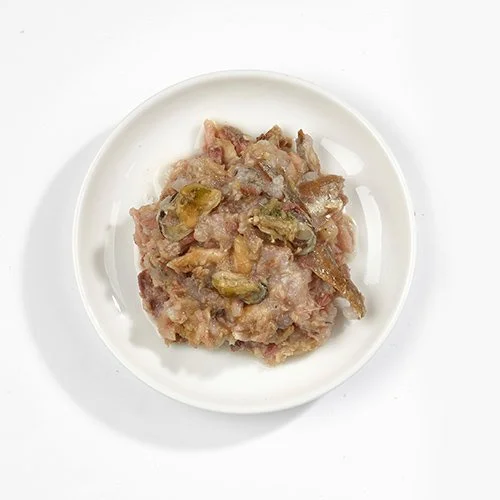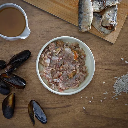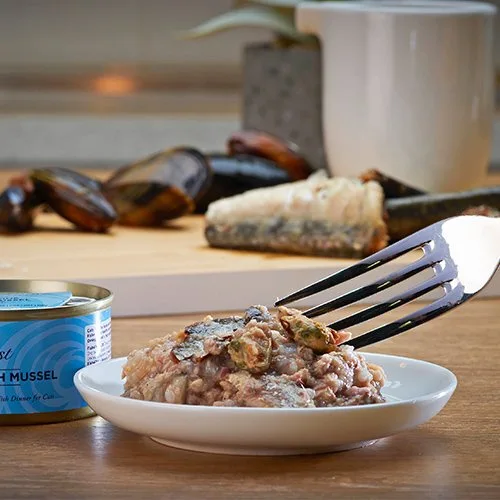 イワシベースに緑イ貝と、食感を良くするためにライスに加え栄養抜群のフィッシュスープのみという贅沢な缶詰シリーズ。