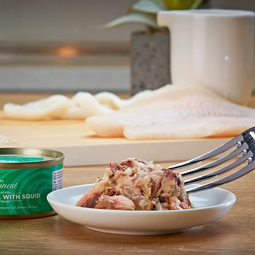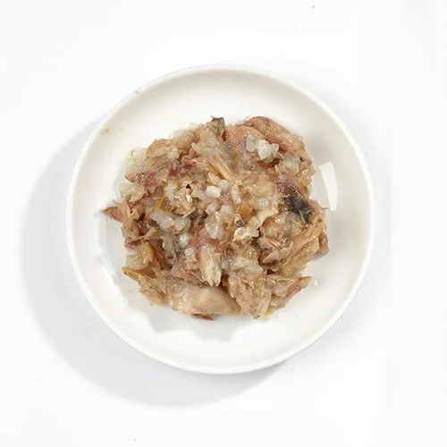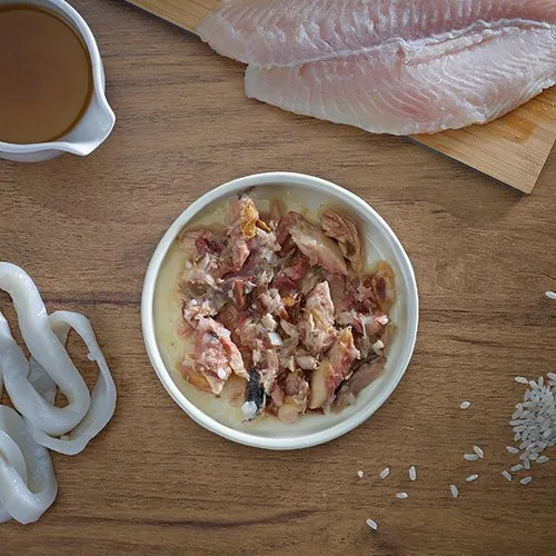 サバベースにイカと、食感を良くするためにライスに加え栄養抜群のフィッシュスープのみという贅沢な缶詰シリーズ。