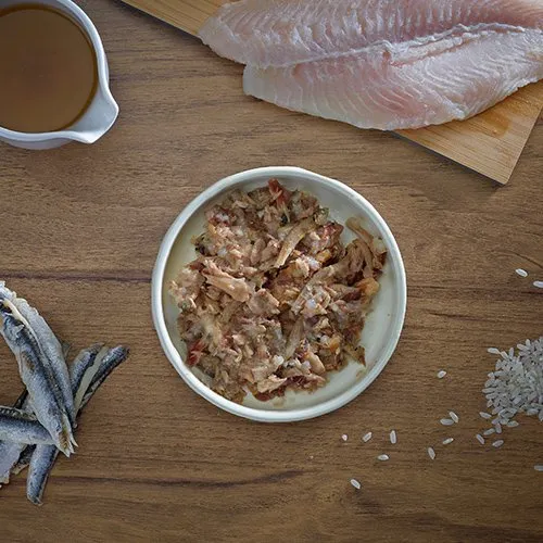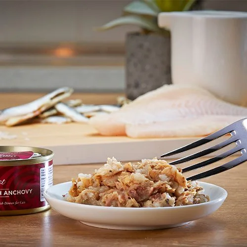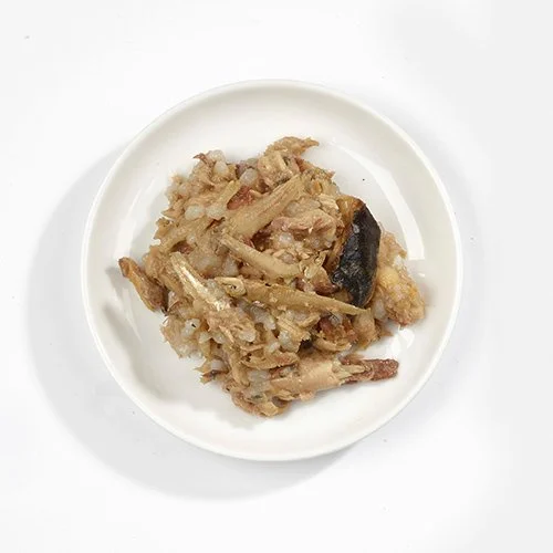 サバベースにアンチョビと、食感を良くするためにライスに加え栄養抜群のフィッシュスープのみという贅沢な缶詰シリーズ。