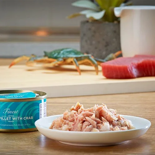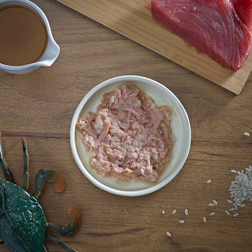 ツナベースにカニと、食感を良くするためにライスに加え栄養抜群のフィッシュスープのみという贅沢な缶詰シリーズ。