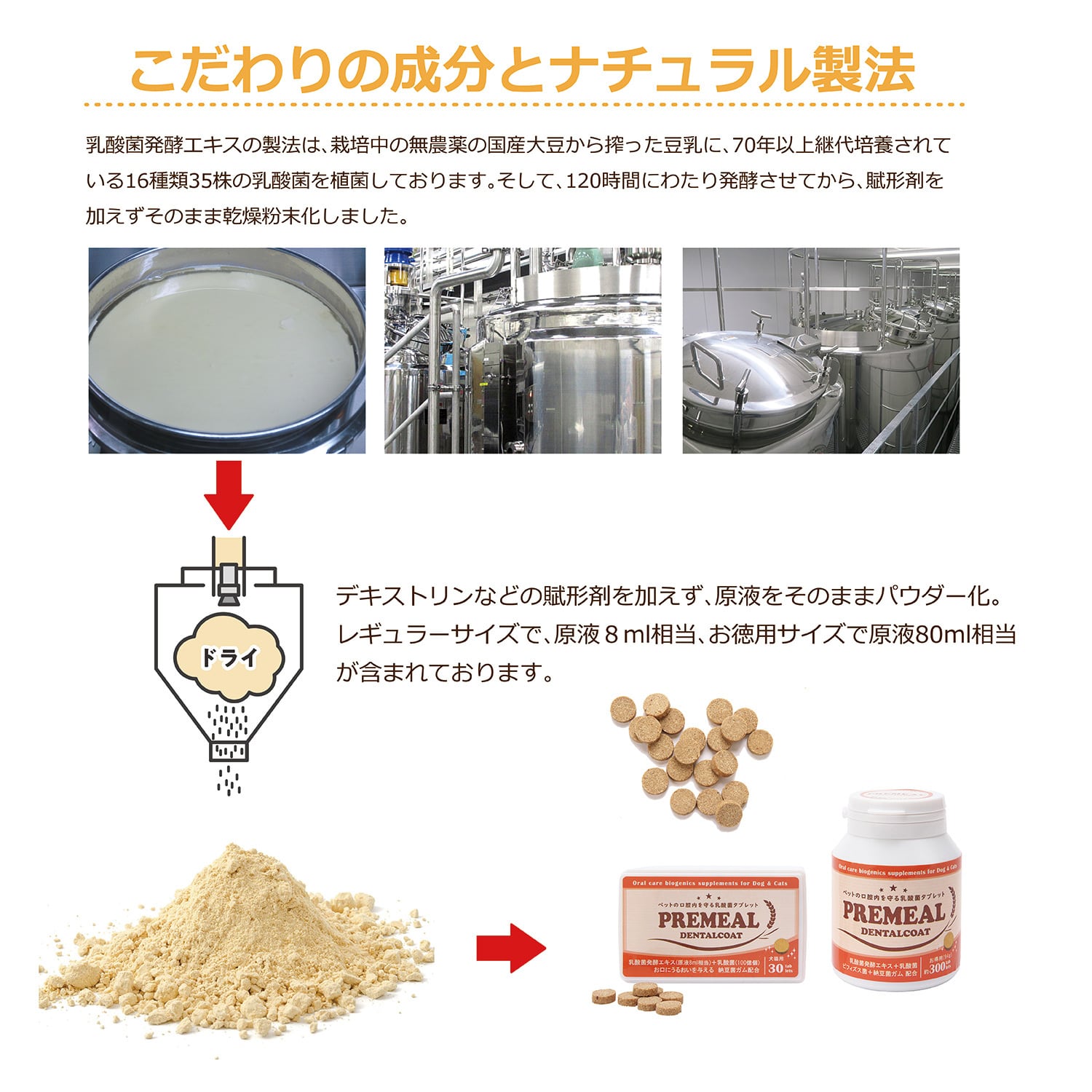 PREMEALは3粒で16種類もの乳酸菌・ビフィズス菌がヨーグルト1カップ分と、乳酸菌たちが作る乳酸菌生産物質を800㎎取れるようにしております。(お徳用サイズ原液80ml配合)